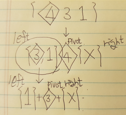 왼쪽 배열만 본다면 { 3, 1 } 로 다시 3을 기준(Pivot)으로 분할을 한다면 { 1 } + Pivot +{X} 이 될 것이다.